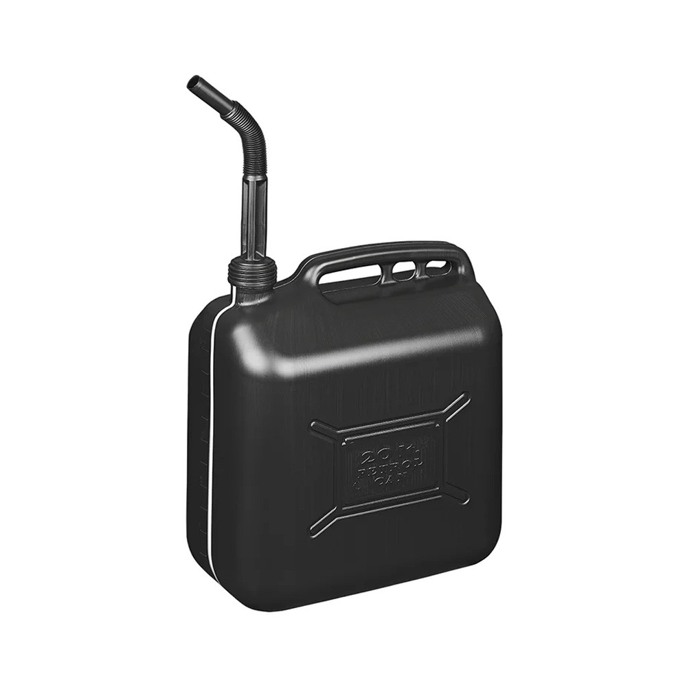 Jerrycan en plastique noir de 20 litres avec entonnoir anti-débordement. Non homologué et équipé d'une ligne de remplissage. Le jerrycan est en polyéthylène haute densité renforcé.
