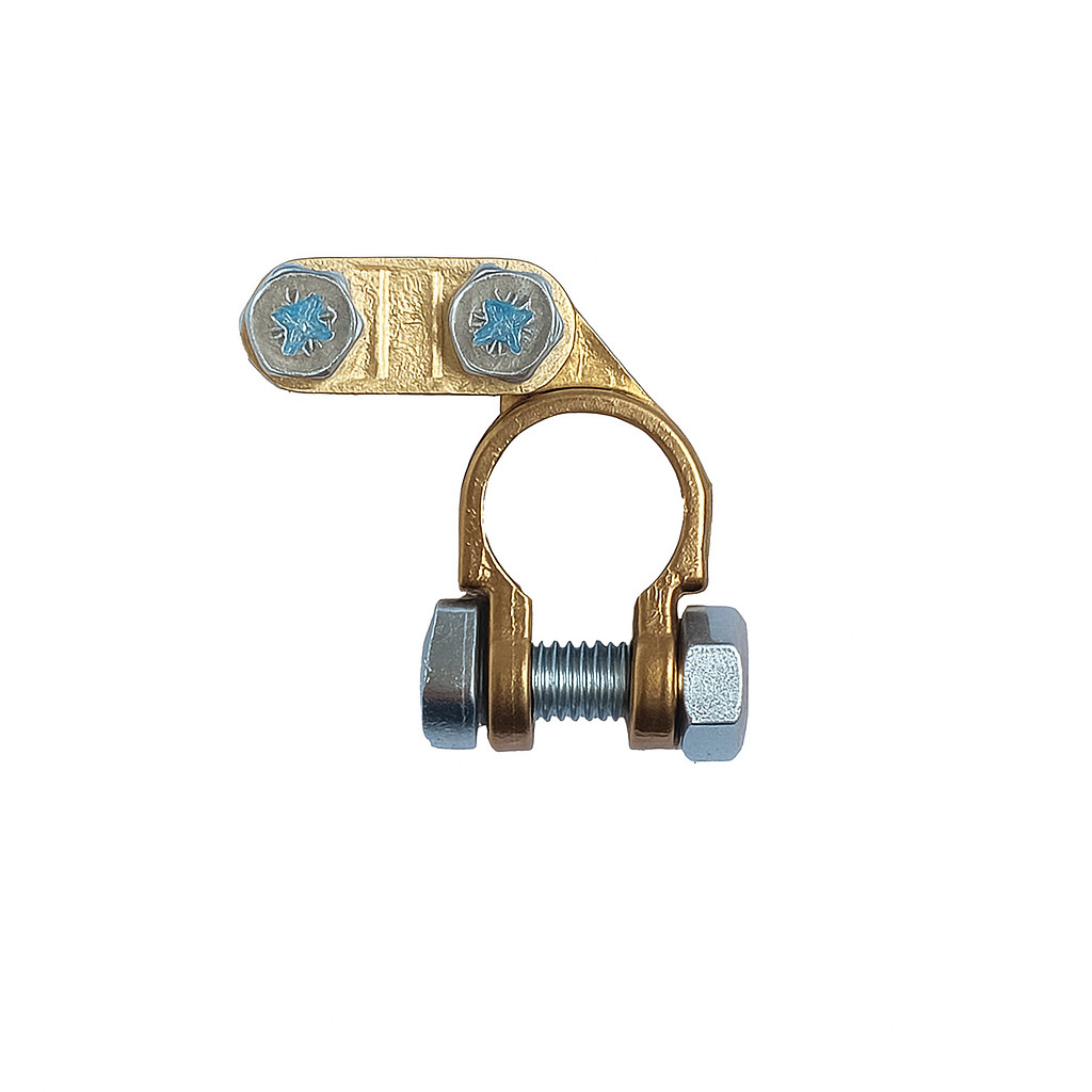 Cosse de batterie standard pour la borne négative, version légère. Équipée d’un écrou hexagonal avec boulon verrouillé pour une fixation solide et sûre.