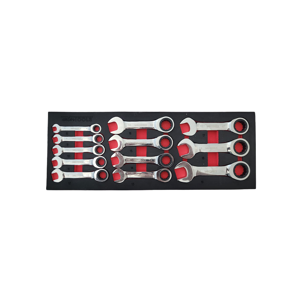 Ce jeu de clés de 12 pièces est présenté dans une mousse pour une utilisation dans les chariots à outils. Ce jeu de clés à anneau est extra court pou les travaux dans un espace limité.