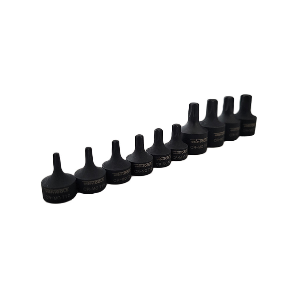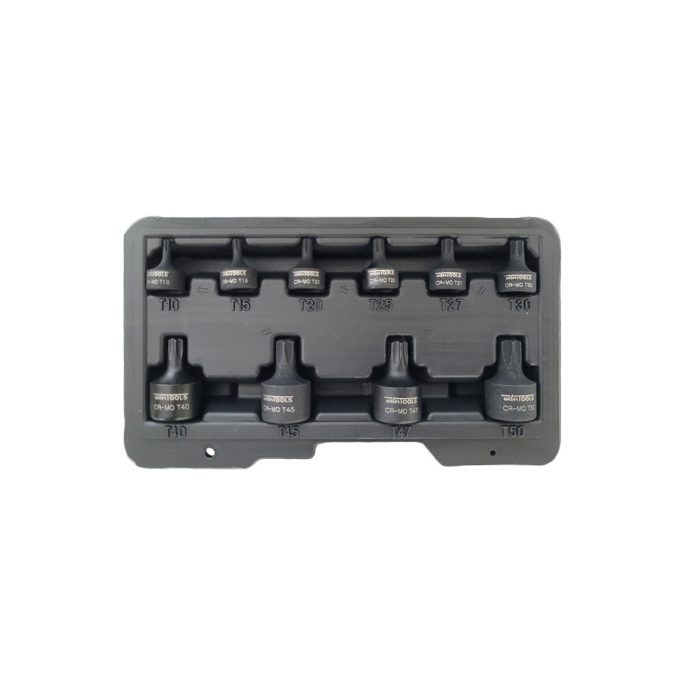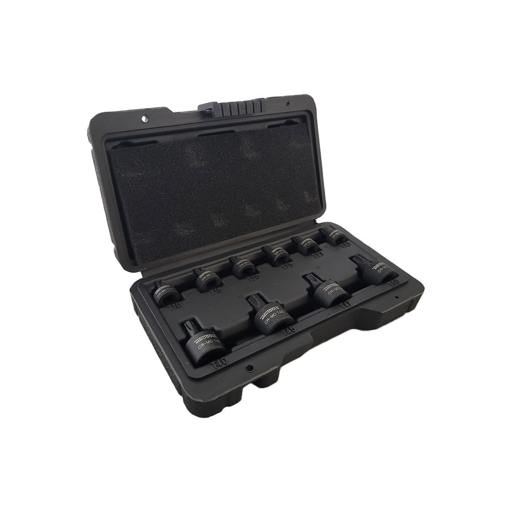 Le jeu de douilles à chocs comprend 10 douilles pour différents types d'entraînement. Les douilles ont des têtes Torx.