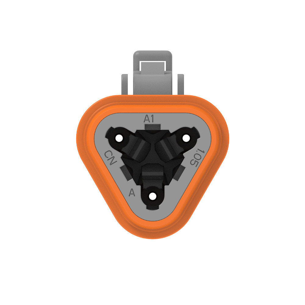 Connectorbehuizing voor vrouwelijke contacten in 3-polige uitvoering met driehoekige vorm, ideaal voor draad-tot-draadverbindingen. Voorzien van geïntegreerde vergrendeling en afdichting voor een veilige en waterdichte koppeling.