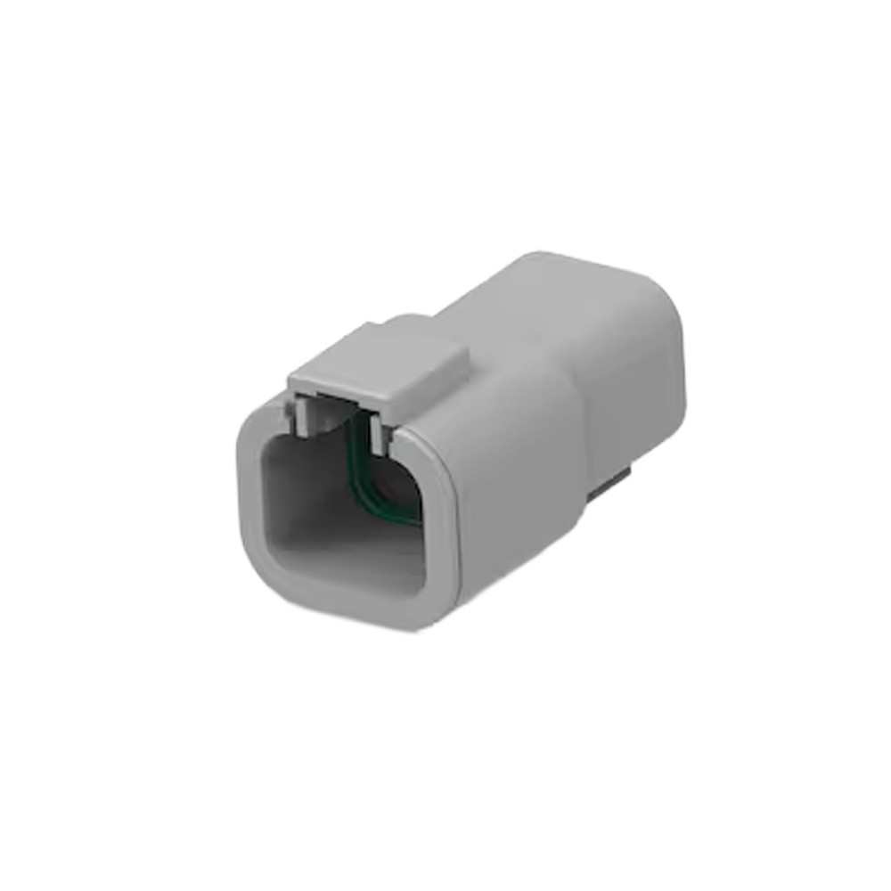 Connectorbehuizing voor Deutsch DTP in 4-polige uitvoering, geschikt voor mannelijke contacten en ontworpen voor draad-tot-draad toepassingen. Uitgevoerd in grijs en vervaardigd uit PA 66 GF15 voor hoge sterkte en duurzaamheid.