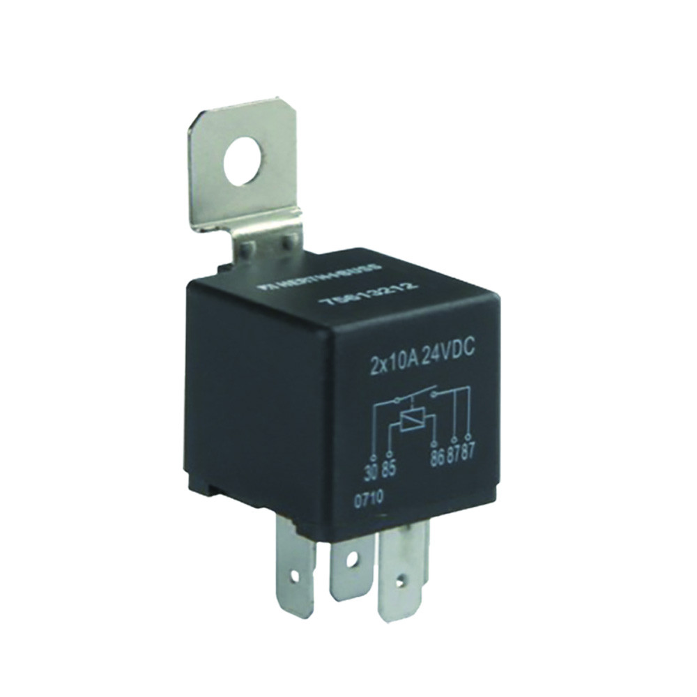 Relais voor 24V-systemen met een schakelvermogen van 20A, ideaal voor het schakelen van verlichting, ventilatoren en andere elektrische verbruikers. Ontworpen voor een betrouwbare werking in voertuigen en elektrische installaties.