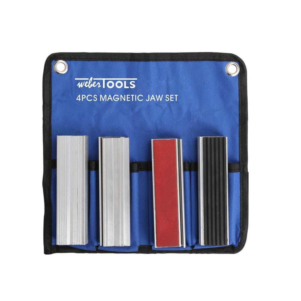 Weber Tools magnetisch beschermbekken set voor de bankschroef. Dit set bestaat uit 4 soorten magnetische beschermbekken die voorkomen dat voorwerpen in de bankschroef worden beschadigd. De bekken hebben een lengte van 100 mm.