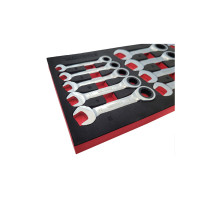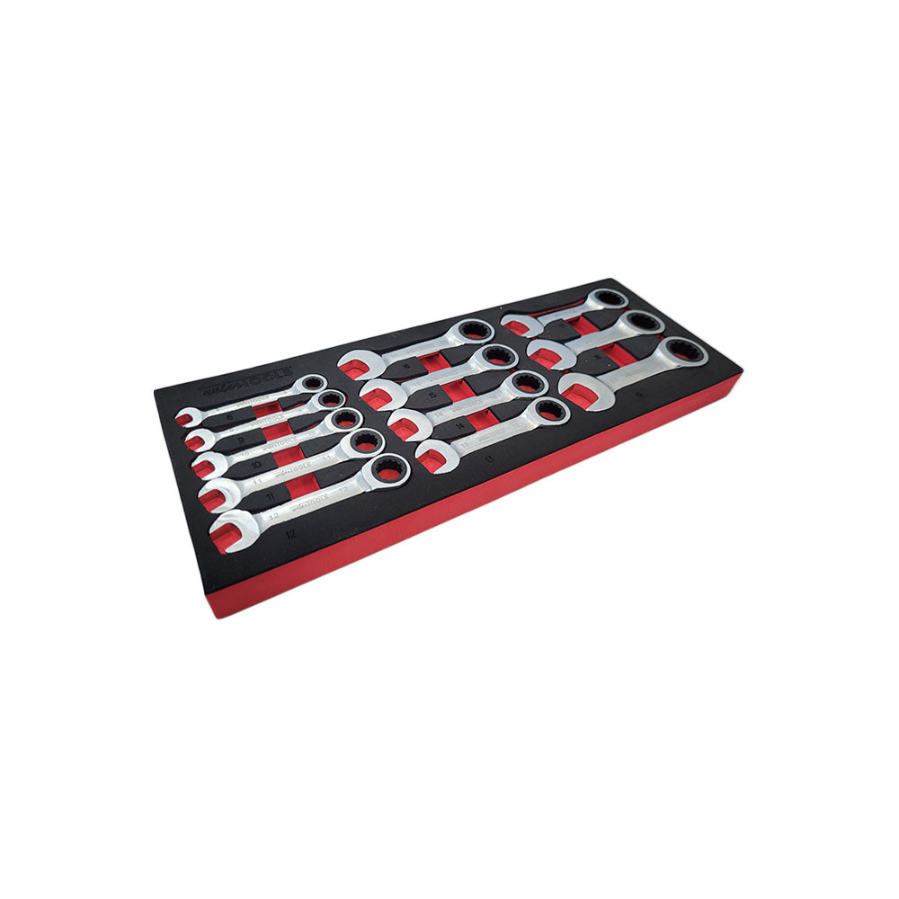Deze 12-delige sleutelset zit in een foam voor in gereedschapswagens. Deze set van steekringratelsleutels is extra kort voor werkzaamheden met beperkte ruimte.