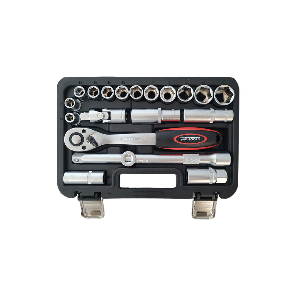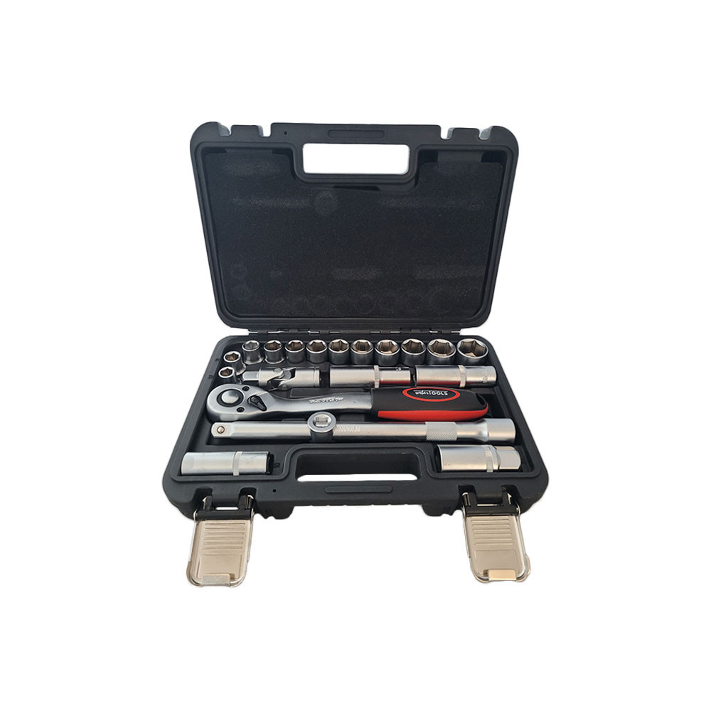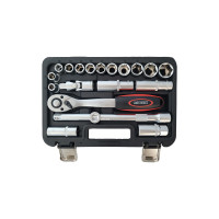 Deze 20-delige doppenset van hoge kwaliteit heeft een 1/2 aandrijving. De set bevat een ratel, 2 lange doppen, doppen van 10-24mm, kniegewricht, een verlengstuk, een adapter voor verlengstuk 3/8 x 1/2 en een boegiedop 16-21mm.