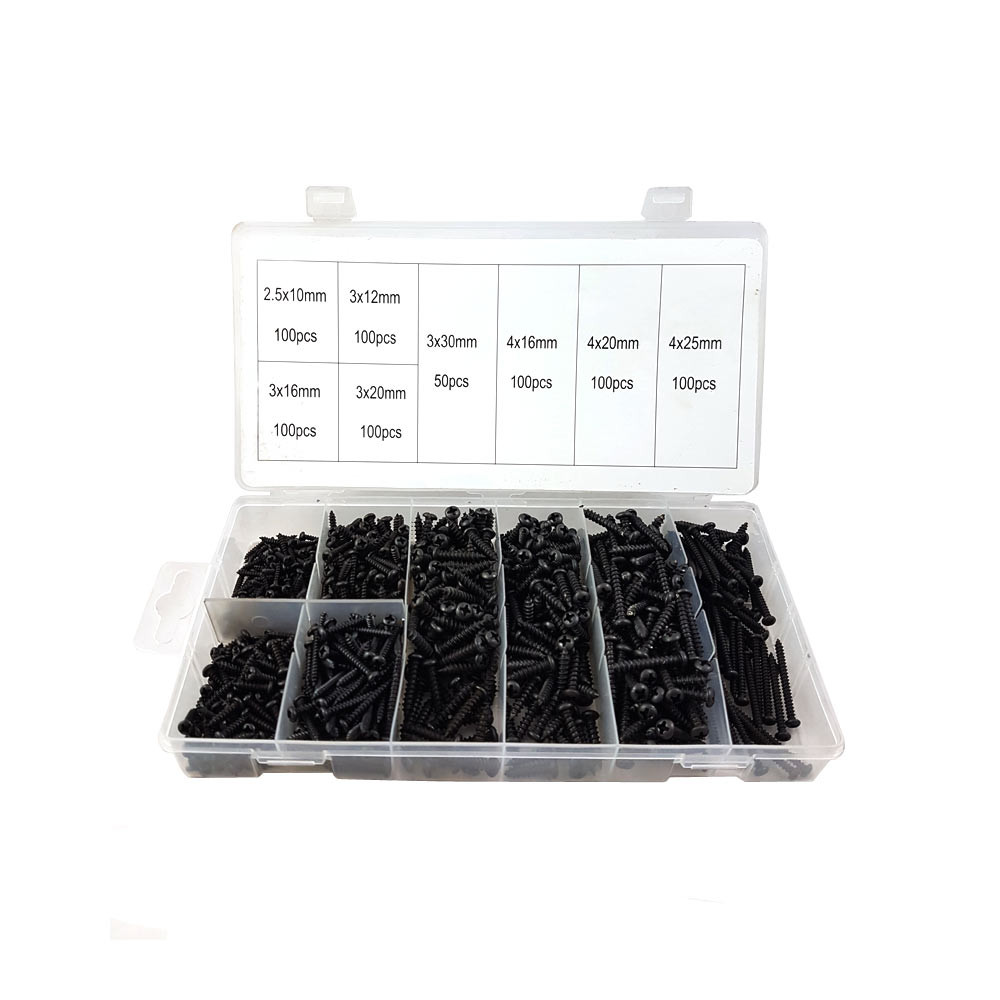 Gevuld met diverse maten zwart gefosfateerde zelftappende parkers van M3 en M4.