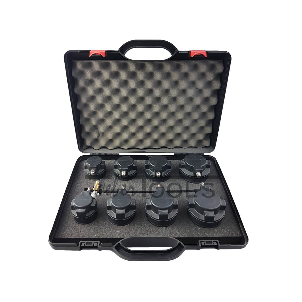 In dit set zitten doppen voor het enerzijds afdoppen en doppen voor het anderzijds op druk zetten van het systeem.