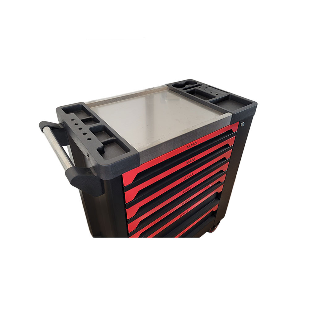Deze volledig nieuw ontworpen gereedschapswagen is de ideale werkpartner voor iedere doe-het-zelver of hobby monteur. De wagen is uitgerust met 7 ruime, kogelgelagerde lades en wordt compleet geleverd met maar liefst 250 stuks professioneel gereedschap, overzichtelijk opgeborgen in 6 foam-inlays. De olie- en benzinebestendige foam heeft exact uitgesneden vormen, waardoor elk stuk gereedschap een vaste plek heeft. Dankzij het tweekleurige ontwerp is in één oogopslag zichtbaar als er iets ontbreekt. Dankzij vier gelagerde wielen, waarvan twee zwenkwielen met rem, is de gereedschapswagen eenvoudig verplaatsbaar. De sterke lades zijn 100% uittrekbaar, zodat ook het gereedschap achteraan in de lade toegankelijk is. De wagen is voorzien van een cilinderslot om alle tools veilig af te sluiten na gebruik. LET OP: De lades zijn niet uitgerust met een automatisch ladeblokkeersysteem. Belangrijkste kenmerken: • 250-delig gereedschapsassortiment • 7 kogelgelagerde, volledig uittrekbare lades • 6 foam-inlays met vaste posities voor ieder gereedschap • Olie- en benzinebestendig foam • 2 zwenkwielen met rem + 2 vaste wielen • Cilinderslot voor centrale vergrendeling • Roestvrijstalen topblad + geïntegreerde iPad-houder • Zijkast met extra opbergruimte (afsluitbaar) Technische specificaties: • Afmetingen wagen: 770 x 460 x 970 mm • Afmetingen lades: 5x: 530 x 410 x 70 mm 2x: 530 x 410 x 140 mm • Afmetingen zijkast: 700 x 400 x 110 mm Inhoud per lade: Lade 1 – Schroevendraaiers & torx Inclusief slagkopschroevendraaiers, precisieschroevendraaiers, torx T6 t/m T40. Lade 2 – Doppensets 1/4", 3/8", 1/2" Volledig ratelsysteem met doppen in standaard en lange uitvoeringen. Lade 3 – Bit- & stiftdoppenset Torx, pozidriv, philips, inbus, veeltand, resistorx, ribe en diverse verlengstukken. Lade 4 – Steekringratelsleutels Maten 8 t/m 22 mm. Lade 5 – L-greep sleutels Inbus en torx L-sleutels, compleet van H2 t/m H10 en T10 t/m T50. Lade 6 – Tangen & hamers Inclusief combinatietang, circliptangen, punttangen, bankhamer, waterpomptang en pendrijvers.