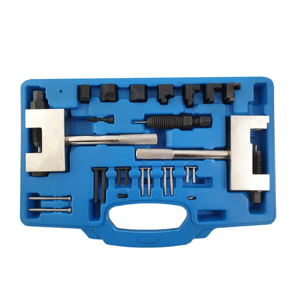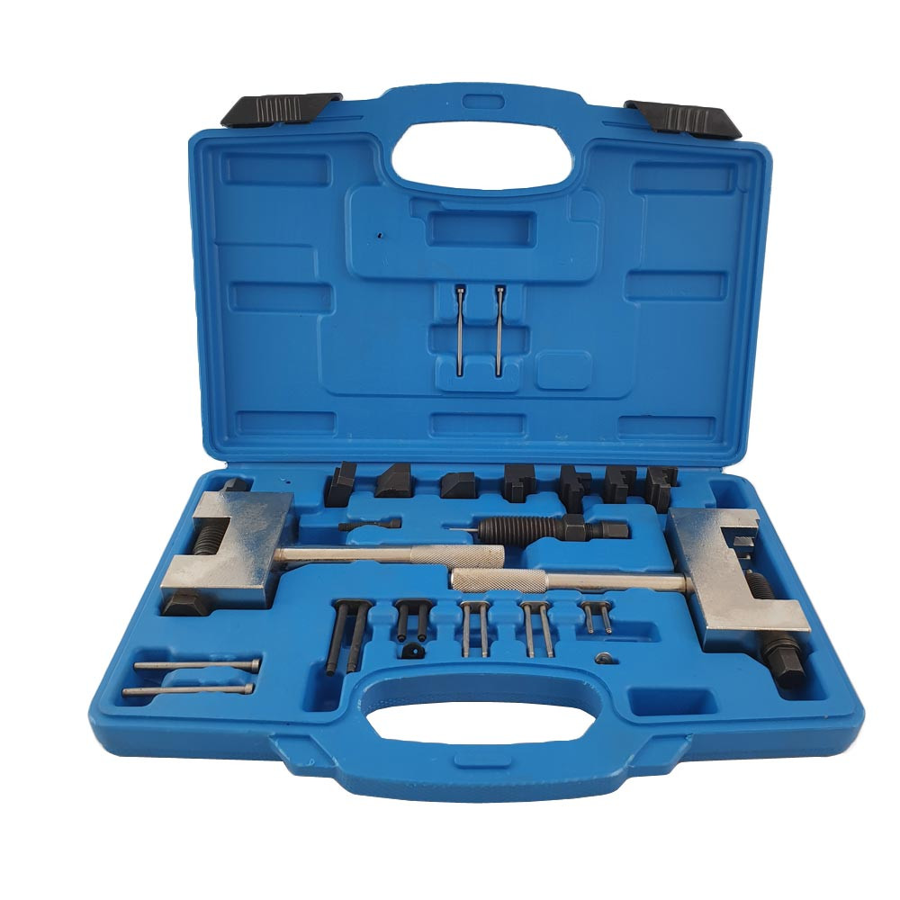 Deze set zorgt voor het splijten en aanbrengen van de distributieketting van de Mercedes-Benz modellen. Het gereedschap zorgt voor een snelle en eenvoudige demontage. Geschikt voor enkelzijdige en dubbelzijdige kettingen. Geschikt voor Simplex en Duplex ketting voor de meeste BENZ diesel en benzine motoren.