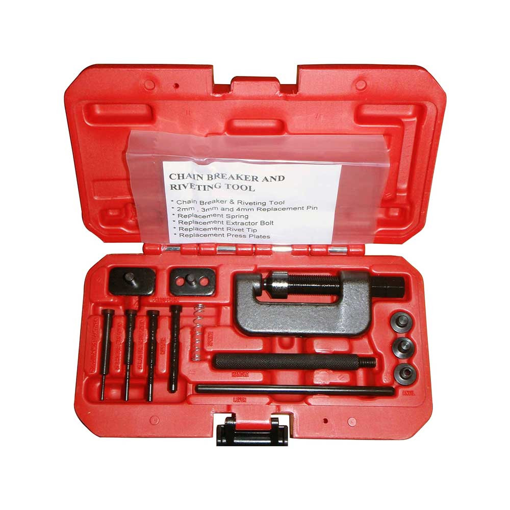 Kettingklinker voor het klinken of losmaken van schakels in motorkettingen, geschikt voor zowel aandrijfkettingen van een motorfiets als distributiekettingen van een personenauto.